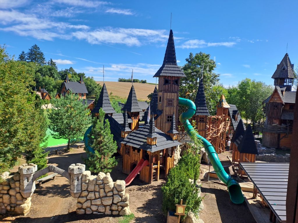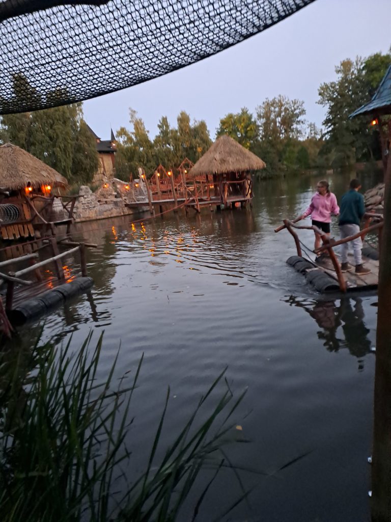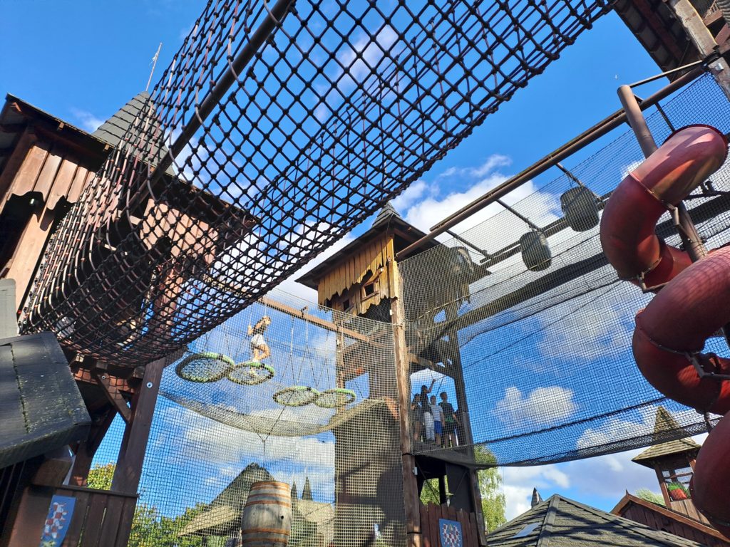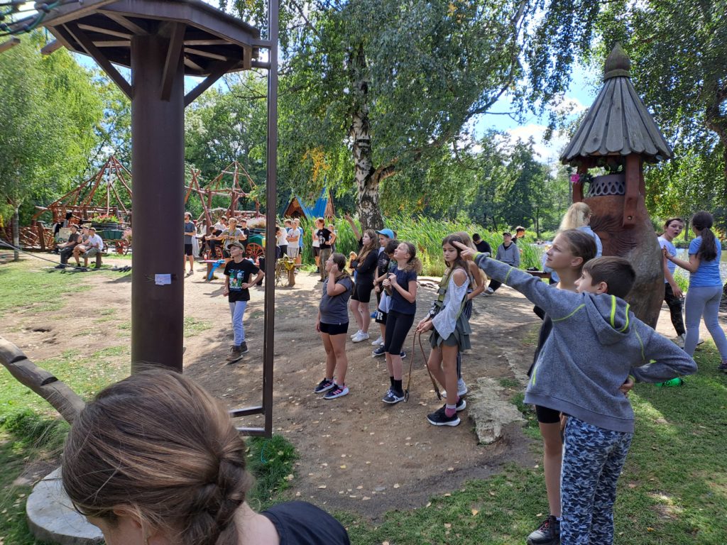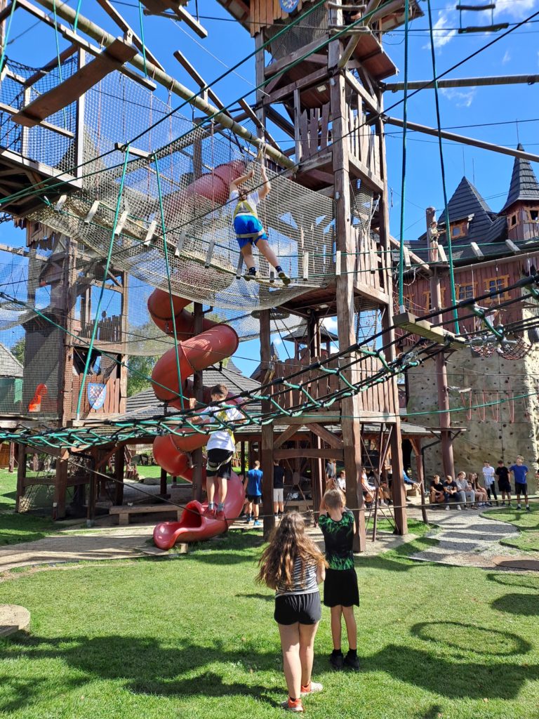 Druhý den jsme začali ráno v půl osmé vynikající snídaní. Protože pršelo, museli jsme bohužel z programu vypustit rafty a místo nich jsme si zahráli zajímavé hry. Jakmile pršet přestalo, vydali jsme se ke 14 metru vysoké věži, ze které si děti vyzkoušely free fall. Pak nás ještě čekala horolezecká stěna a oběd.
